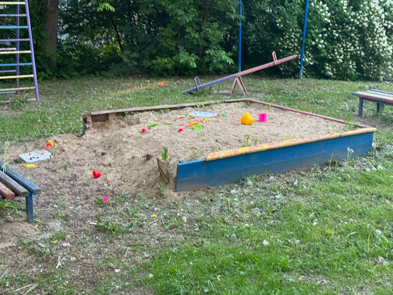 • Дом №12: сломанные качели, оторванный бортик песочницы с гвоздями, мусор.